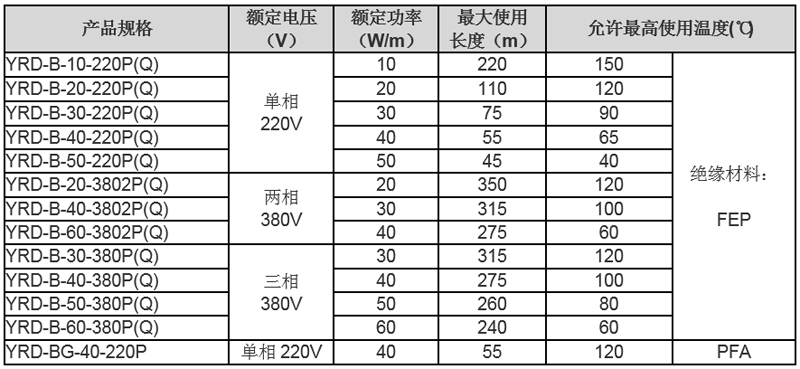 4)建議YRD-B型的恒功率并聯式電熱帶用于伴熱溫度90℃及以下,YRD-BG型的恒功率并聯式電熱帶用于伴熱溫度120℃及以下。