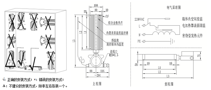 電加熱器的安裝要利于散熱,不能被遮覆。安裝位置:可水平安裝在箱體底板上(如上面箱體內(nèi)實(shí)際應(yīng)用圖),也可垂直安裝在箱體側(cè)板或者背板上(接線盒在下,靠近箱體底部)。具體可參考下頁安裝示意圖。